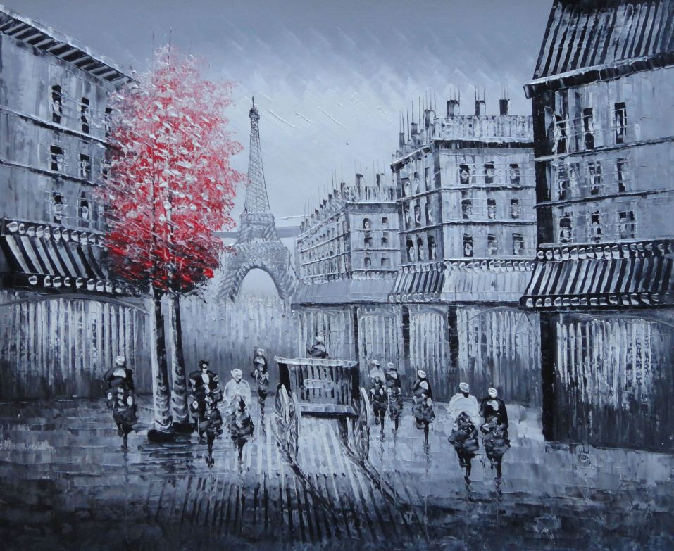 Paris Street to Eiffel Tower Black and White Oil Painting 20 x 24 Inches