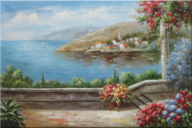 Patio, Red-Roof House, Flower Gardens of Mediterranean Coast Oil Painting 24 x 36 Inches